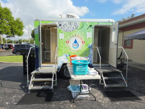 Flavia Souza-Pereira, office manager and human resources generalist, explains that the Salvation army “is here to serve in times of need.” This Wednesday morning, while the food pantry distributes groceries out front, volunteers from First Methodist Church wearing OLYN (Operation Love Your Neighbor) t-shirts hand out shower supplies around the back. By 10:45, nineteen people had already come in, and one more GoLine bus was expected to arrive soon. People can shower and change into fresh clothing stored in two trailers parked across the lot.