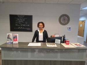 Beyond the food pantry, Subrena Perrotte, social services and case worker, greets people as they arrive and helps figure out what they need. Along the wall in front of her desk is a shelf of donated toiletries and other supplies from CVS that are available for the taking.